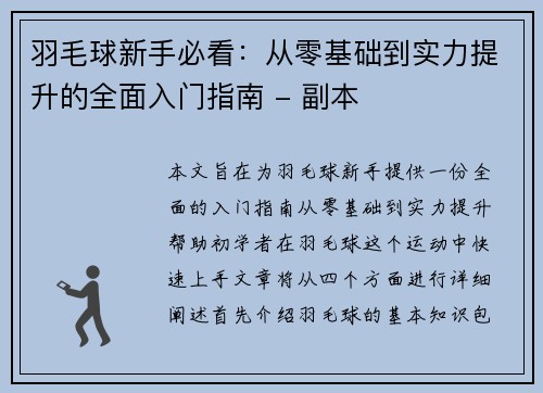 张敏,作为羽毛球界的一颗璀璨明珠,从年轻时的羽毛球新星一路成长为备受尊重的传奇教练,她的心路历程充满了奋斗与坚持。在这篇专访中,我们将深入探讨她从运动员到教练的转变,以及在这个过程中所经历的挑战和收获。文章将从张敏的职业生涯起步、训练与比赛中的心态变化、作为教练后的教育理念以及对未来羽毛球发展的展望...
